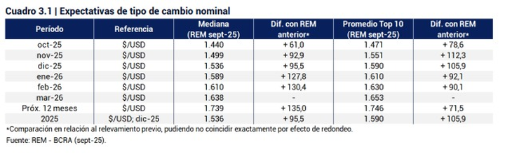 La mediana de las proyecciones de tipo de cambio nominal se ubicó en $1.440 para el promedio de octubre de 2025. La cifra es casi idéntica al valor actual de la divisa ($1.430), aunque vale aclarar que la encuesta del BCRA se realizó en los últimos días de septiembre, cuando el oficial mayorista estaba todavía por debajo de los $1.400. Para el Top 10 de analistas el tipo de cambio nominal promedio esperado para octubre es bastante superior, de $1.471.
